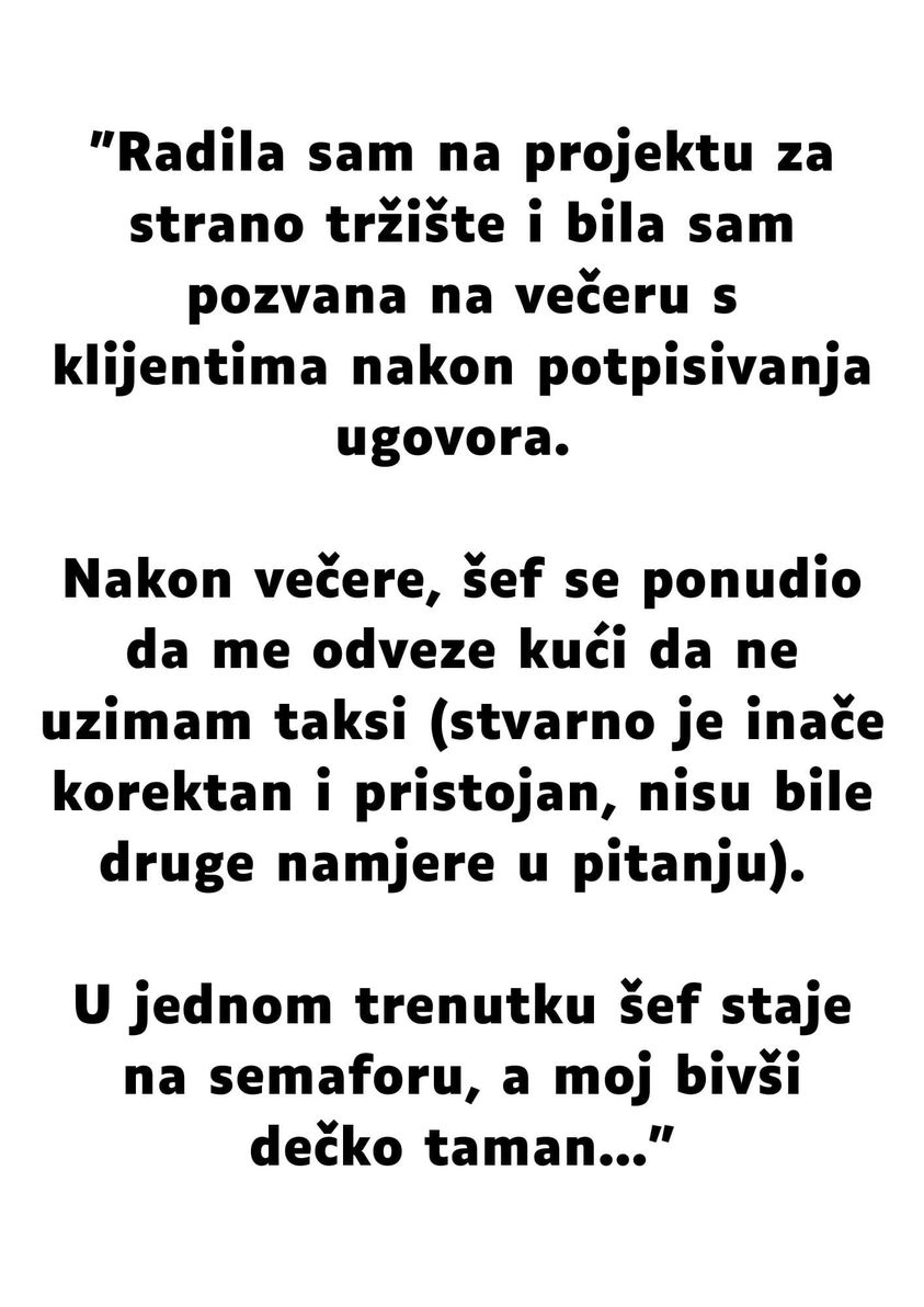 Nakon večere, šef se ponudio da me odveze kući da ne uzimam taksi (stvarno je inače korektan i pristojan, nisu bile druge namjere u pitanju).