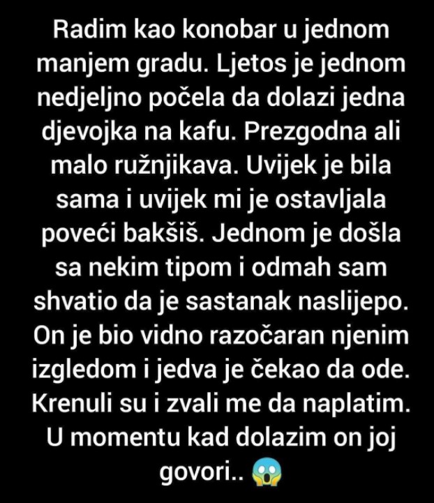 Radim kao konobar u jednom manjem gradu. Ljetos je jednom nedjeljno počela da dolazi jedna djevojka na kafu. Prezgodna ali malo ružnjikava.