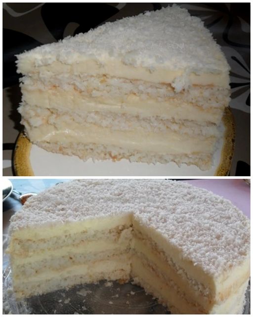 Slagati: kora, fil, kora, fil, kora, fil, posuti kokosom i dobro ohladiti.