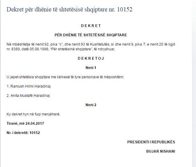 U ukazu objavljenom na internet strani predsjednika Albanije navodi se da je državljanstvo te zemlje dodjeljeno Haradinajevima na njihov zahtjev kao i da ta odluka stupa na snagu danom potpisivanja.