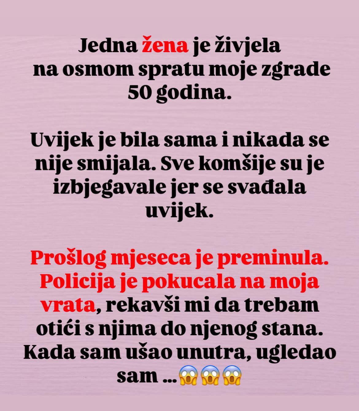 – Jedna žena je živjela na osmom spratu moje zgrade 50 godina. Uvijek je bila sama i nikada se nije smiješila. Sve komšije su je izbjegavale jer se svađala uvijek. Prošlog mjeseca je preminula. Policija je pokucala na moja vrata, rekavši mi da trebam otići s njima do njenog stana. Kada sam ušao unutra, prožela me je jeza: pronašao sam cijeli svoj život prikazan na njenim zidovima—fotografije mene na ulici snimljene s njenog balkona, od kada sam bio dijete do sada. Bilo je to jezivo, ali i veoma zbunjujuće. Ispostavilo se da ova žena nije imala nikoga, a moja prisutnost je nekako pružala društvo. Fotografisanje mene postalo je njen hobi tokom godina. Ono što me još više šokiralo bilo je to što mi je ostavila svoj stan, zajedno s kolekcijom fotografija.