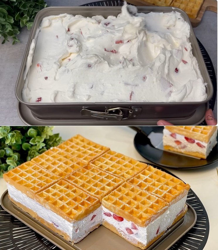 Umutiti slatku pavlaku sa mascarpone sirom. Jagode nasjeckajte i dodajte u smjesu, a zatim sjedinite. Stavite vafle (9 komada) na dno kalupa, a zatim sipajte smjesu na vrh i izravnajte.