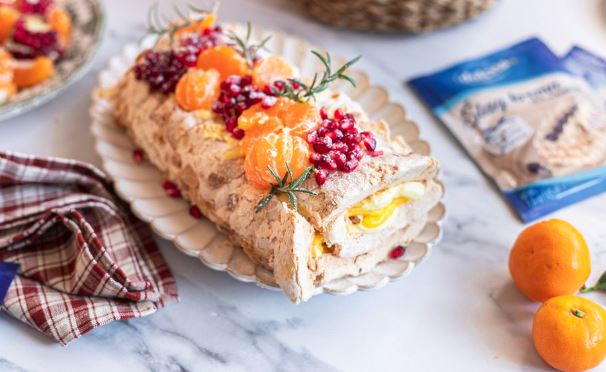 Skinite papir za pečenje na kojem se pekla rolada i premažite roladu kremom od vanilije (ostavite malo za dekoraciju). Rasporedite kremu od mandarina i nježno zarolajte roladu. Ukrasite ostatkom kreme, mandarinama i narom, pospite šećerom u prahu i poslužite.