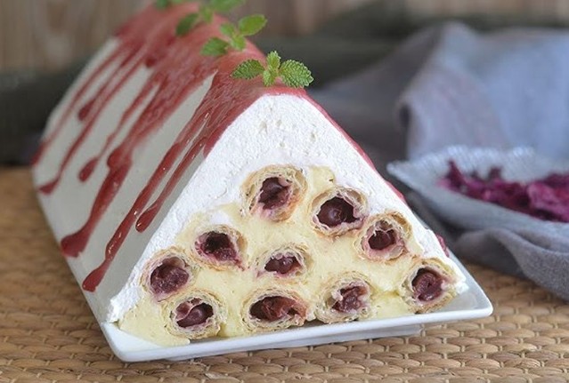 Pripremite lisnato tijesto tako da pobrašnite radnu površinu i razvaljate odmrznuto tijesto.Krajeve poravnajte tako da bude dimenzije 30 x 30 cm.Izrežite na trake širine 6 cm.Višnje prebacite u cjediljku i ostavite da se dobro ocijede.Na sredinu postavite ocijeđene višnje.