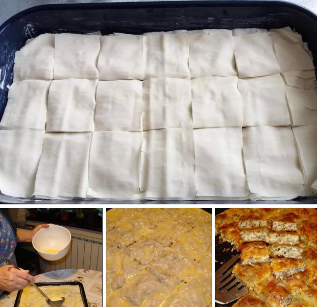 U nauljen pleh staviti 2 kore pa posuti nadjevom. Može odmah i vruć nadjev