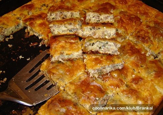Sastojci:Glavni sastojci:500 gr kora za pite( oko 10 listova).Nadjev:500 gr mljevene junetine,2 kom luka,1 šaka peršinovog lista,nešto soli i papra,1 dl ulja.Preliv:2 dl jogurta,2 dl mineralne vode,4 kom jaja,malo soli.