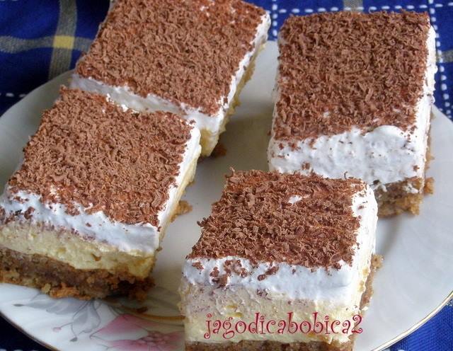 NAČIN PRIPREME:Od bjelanaca umutite čvrsti snijeg,dodajte brašno,šećer i orahe.Pleh pomastite i pospite brašnom,izlijte smjesu i ispecite koru.U drugoj posudi dodajte žumanca,šećer,vanilin šećer,zatim puding i kašiku brašna pa sve kuhati u mlijeku kao puding.Sve ostaviti po strani da se ohladi.Margarin izraditi sa prah šećerom i dodajte u prohlađenu kremu.Zatim kremom namažite ohlađeni biskvit.Umutite šlag i namažite preko kolača.Dodatno po želji ukrasite čoko mrvicama i ostavite da se hladi u frižideru.