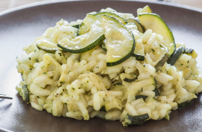 Sastojci:1250 ml povrtnog ili pilećeg temeljca;320 g riže arborio;80 ml ulja;65 ml suhog bijelog vina;30 g naribanog parmezana;3 žlice maslaca;2 tikvice;1-2 češnja češnjaka;sol i papar po želji