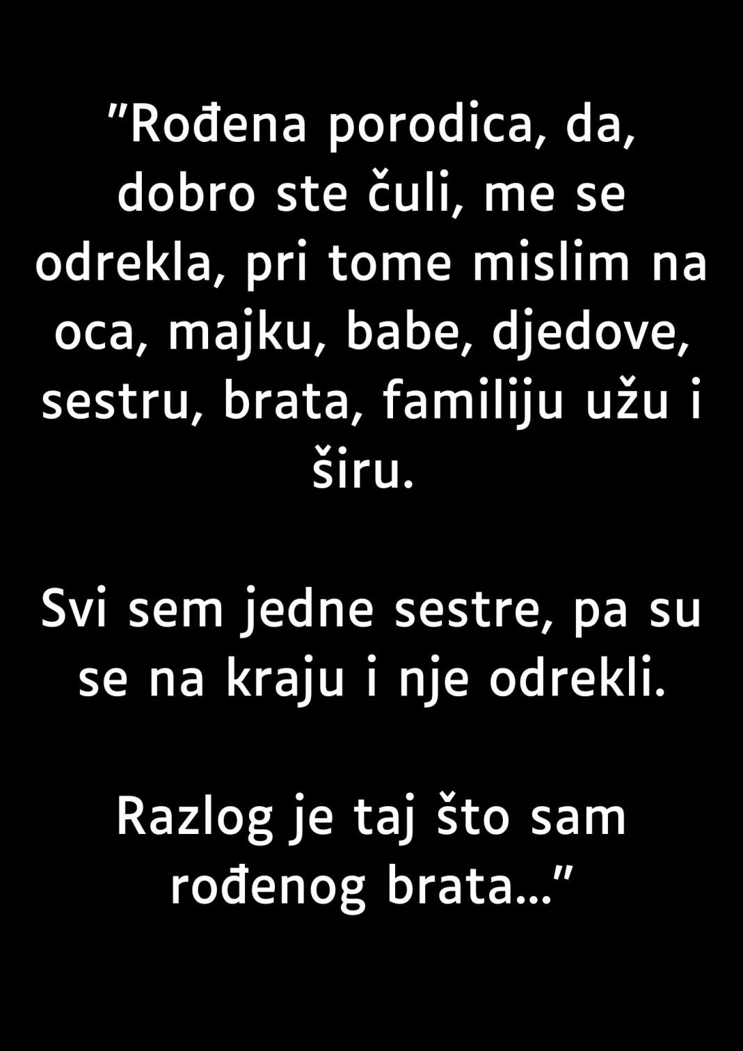 “Rođena porodica, da, dobro ste čuli, me se odrekla, pri tome mislim na oca, majku, babe, djedove, sestru, brata, familiju užu i širu, svi sem jedne sestre, pa su se na kraju i nje odrekli.