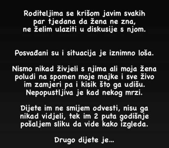 Drugo dijete je na putu i ne vidim da će njih troje ikad moći normalno sjesti. Sa sestrom, bratom i njegovom obitelji također nemamo kontakt jer su stali na stranu roditelja i to mojoj ženi nije odgovaralo, očekivala je njihovu naklonost.