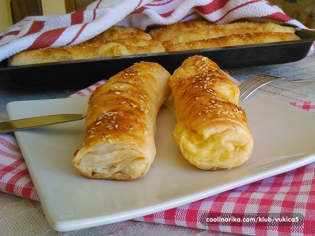 Sastojke za fil sjediniti i dobro izmešati.Uzeti jedan list kore za pitu, presaviti jedan ugao spojiti sa drugim uglom tako da se dobije trougao ako nije pravilan nema veze (vidi sliku). Trougao premazati sa filom.Jedan kraj preklopiti na jednu staranu, drugi kraj na suprotnu stranu, opet premazati filom i uviti u rolnicu.Uvijene rolnice staviti u pleh prethodno podmazan. Redjati jednu do druge i preostalim filom premazati rolnice. Peći na 200 stepeni dok ne dobiju zlatno žutu boju.