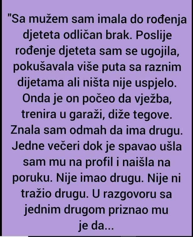 U razgovoru sa jednim drugom stidljivo mu je priznao da nam odnos u krevetu nije kao ranije, da mu moja debljina smeta i da mu je od svega najteže što ne može da me uzme u naručje i odnese u spavaću sobu da vodimo ljubav, to mu je vrhunac strasti, zato je počeo da vježba, ne želi da se odrekne tog rituala.