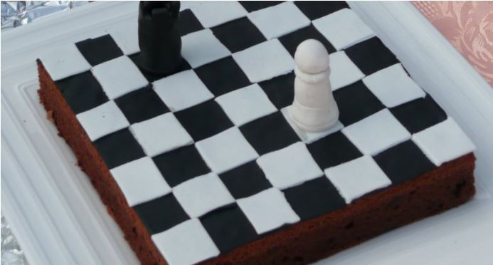 Jedan list žute kore i jedan list tamne kore ostavite cele, a ostala dva lista (žuti i crni) isecite u kvadrate široke 4 cm. Premažite kremom žutu koru, pa preko nje ređajte kvadrat žutog, pa kvadrat crnog testa, tako da cela površina dobije izgled šahovske table.Kada svi kvadrati budu poređani ponovo premažite kremom pa poklopite sa crnom korom koju ste prethodno ostavili. Kremom koji je preostao, premažite tortu spolja i pospite je topljenom čokoladom.