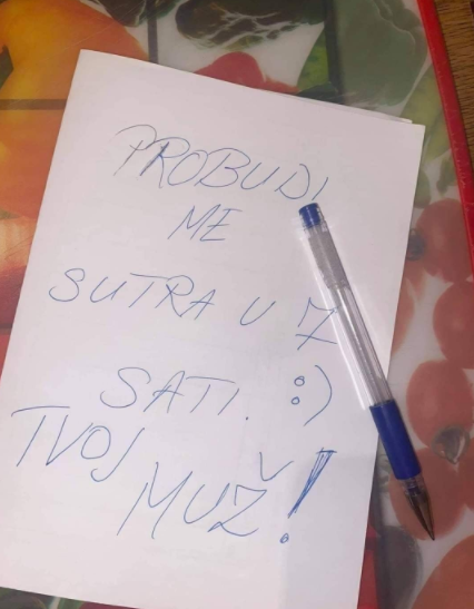 Četvrti dan žena nađe na stolu papir na kojem piše: ‘Probudi me sutra u sedam sati. Tvoj muž.’