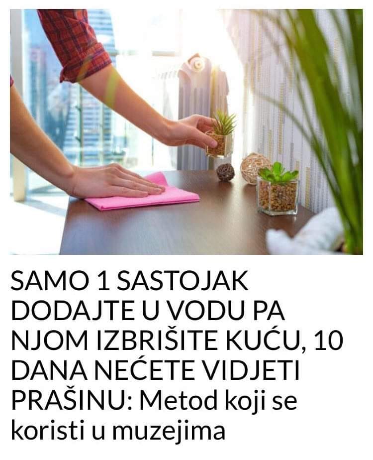 Da biste to uradili, dodajte malo glicerina u posudu sa vodom. Pokvasite krpu tom vodom i prebrišite površine. Prašinu nećete vidjeti najmanje 10 dana. Ova metoda čišćeja se koristi u muzejima.