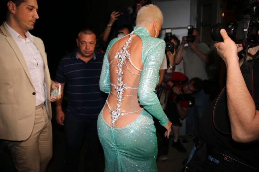 Stigla je u zelenoj haljini sa golim leđima, čiji se otvor protezao sve do polovine zadnjice, a nakit na haljini spuštao se niz kičmu…