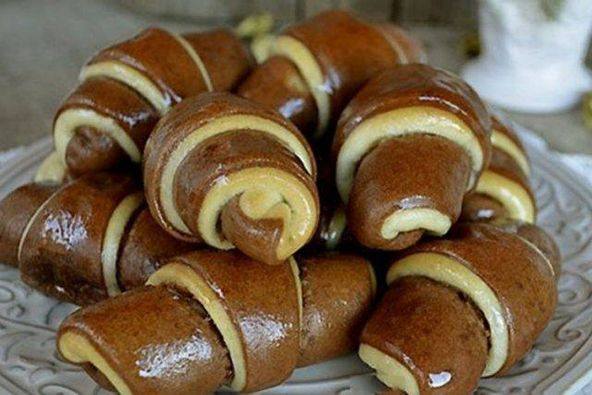 Svaki deo podeliti na 3 – 4 dela. Dole staviti žuti deo pa odgore braon, tako razvući u krug, iseći trouglove i praviti kifle.