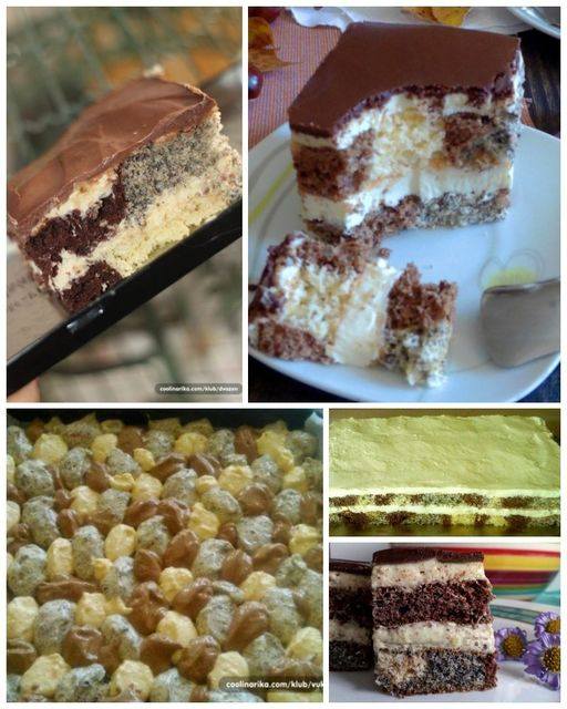 Predivan kolač sa izuzetno finim biskvitom s tri okusa, kokos, mak i kakao, pjenasta kremica s okusom vanilije plus čokoladni preliv mmmm 🙂
