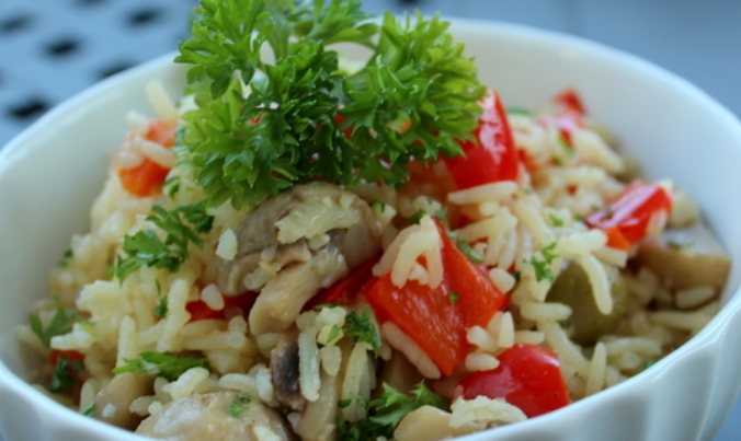 Na zagrijanom ulju propirjati nasjeckani bijeli dio poriluka, dodati sjeckane paprike, ploške tikvica i usitnjene šampinjone pa posipati s malo mješavine začinskog bilja.