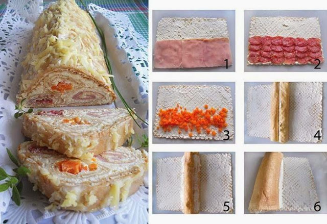 Na jedan, do pola, staviti listove šunke i urolati. Na drugi listove čajne do pola i urolati i na treći seckanu šargarepu do pola i urolati. Na veliki list oblande naneti fil od sira. Staviti dva urolana rolata na sredinu velike oblande, naneti malo fila, pa preko staviti treći rolat da se dobije trougao. Rolate premazati ostatkom fila i preklopiti sa bočnim stranicama velike oblande. Ceo trougao premazati majonezom i posuti rendanim kačkavaljem.