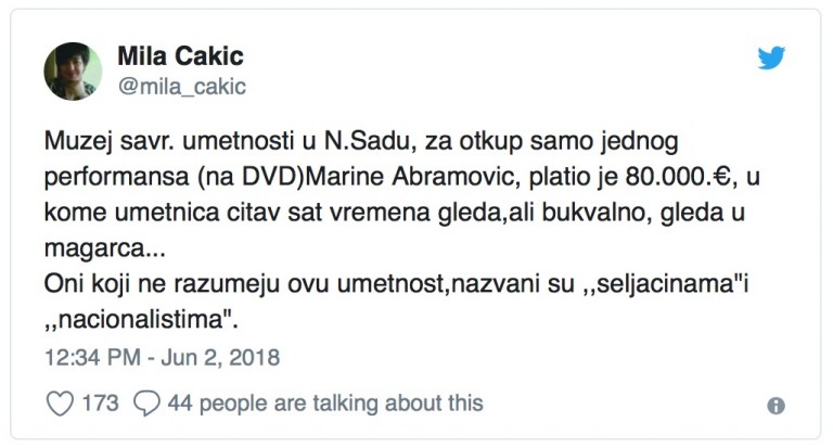 U Srbiji vlada opšta besparica, ima mnogo gladne djece, ali ipak, video u kome Marina Abramović nepomično 60 minuta sjedi i bez zvuka fiksira magarca koji stoji ispred nje, plaćen je više od 100.000 američkih dolara.