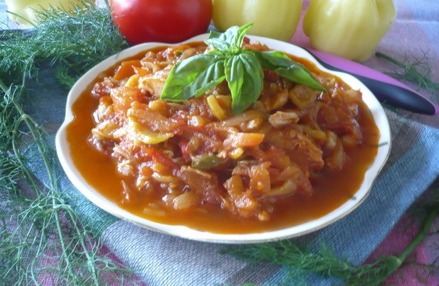 Poslije 5 minuta staviti mrkvu, dodati malo vode i miješati jedno 5 minuta. Dodati bijelo meso i propržiti dok ne dobije bijelu boju tj. ne napravi svoju koricu. Dodati, zatim, paradajz, papriku, promiješati, poklopiti i smanjiti na nižu temperaturuosle 20–25 minuta dodati pola kašičice bibera i pola kašičice soli i promiješati. Ovo možete servirati uz pire ili rižu.