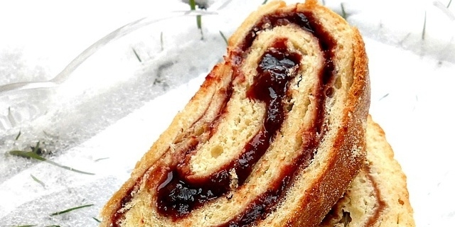 Brašno izmiješamo s praškom za pecivo. Maslac izmrvimo u brašnu, dodamo šećer, jaja i mlijeko te umijesimo glatko tijesto. Razvaljamo ga 1-2 cm debelo i namažemo pekmezom od šljiva. Savijemo i ispečemo. Odozgo namažemo jajetom.