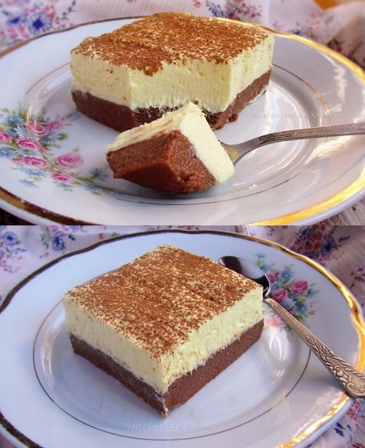 Ostavite kolač da se dobro ohladi minimalno 4 sata, a zatim ga narežite na kocke za posluživanje. Može se ukrasiti kakaom ili ribanom čokoladom.