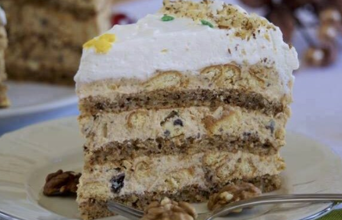 Za pripremu kora kojih morate ispeći 3 komada (dakle, peći tri puta u istom kalupu za torte) miksajte svaki put po 4 bjelanjka. Kada bjelanjci postanu čvrsti.dodati 9 žlica šećera, 4 žlice mljevenog plazma keksa i na kraju 5 žlica mljevenih oraha. Dobivenu masu izliti u kalup za tortu na papir za pečenje (kalup promjera 24 cm), rubove kalupa namastiti i pobrašniti. Peći u pećnici na 180ºC 18 minuta. Kora je gotova kada ravnomjerno posmeđi cijelom površinom. Ako vam je pećnica malo jača, pecite koru koju minutu manje. Kore su u pravilu tanke i ne treba im dugo da se ispeku. Pečenu koru iskrenuti iz kalupa na rešetku, odmah pažljivo odljepiti papir za pečenje, a kalup oprati i pripremiti za drugu koru koja se priprema na identičan način.