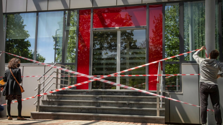 Na glavnom ulazu zgrade Vlade aktivisti SDP postavili su su trake i transparent na kojem je pisalo “Držite udaljenost od objekta – Vlada je u karantinu”.