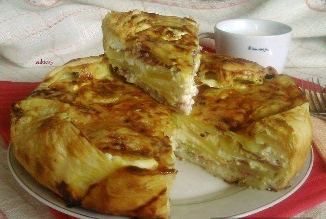 Krompir obariti na pola pa isjeći na kolutove i začiniti po potrrebi.Lisnato tijesto istanjiti na oko 26 cm širine, saviti u kalup 22 cm obložen papirom za pečenje, poravnati a ivice podignuti uz stranice kalupa.Preko staviti 1/2 količine šunke isječene na tanke listiće.Preko šunke staviti jedan dio, oko trećine krompira zatim staviti fetu isječenu na listiće.Staviti i drugi dio krompita, drugu polovinu šunke, može i malo pancete, fetu i treći dio krompira.Umutiti pavlaku, jaja i mlijeko, posoliti i preliti krompir. Naribati tvrdi sir pa saviti ćoškove lisnatog.Peći na 200 C oko 45 minuta ili probosti nožem i provjeriti da li je krompir pečen. Služiti toplo.