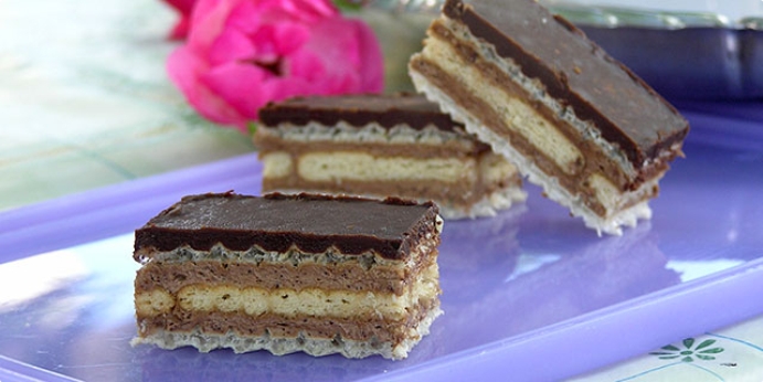 Po kremi posložiti kekse namočene u mlijeko (možete u mlijeko dodati i malo ruma). Kekse premazati drugom polovicom kreme i prekriti oblatnom.