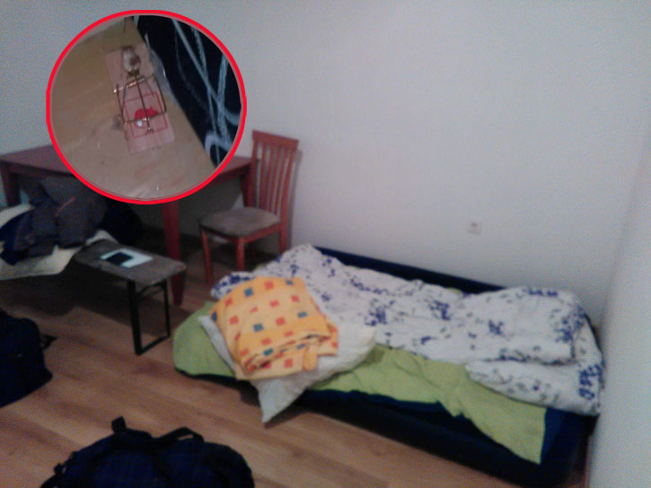 Smješten je u sobu u kojoj je bio samo jedan dušek, koji je morao dijeliti sa još jednom osobom. U sobi je bilo i drugih “podstanara”, jer su po čoškovima postavljene mišolovke. Tmurnu atmosferu upotpunjavale su posude s ubudžalom vodom.