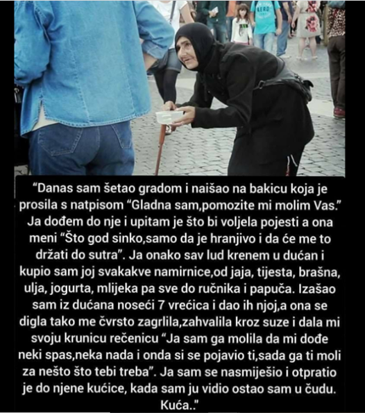 “Danas sam šetao gradom i naišao na bakicu koja je prosila s natpisom “Gladna sam,pomozite mi molim Vas.” Ja dođem do nje i upitam je sto bi voljela pojesti a ona meni “Što god sinko,samo da je hranjivo i da će me to držati do sutra”