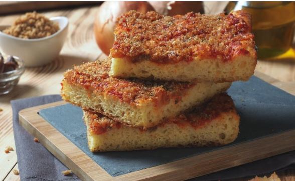 U blenderu usitnite hleb da dobijete prezle, pa dodajte origano i promešajte. Zatim sipajte maslinovo ulje i dodajte rendani parmezan i ponovo promešajte. Uzmite jedno parče testa, pa stavite na pleh obložen pek papirom koji ste premazali uljem, pa malo pritisnite prstima. Stavite inćune na testo (ne previše), pa poređajte dosta sira koji ste deblje isekli i onda stavite dinstani luk. Sve pokrijte napravljenim prezlama, pa sipajte malo maslinovog ulja. Pecite u zagrejanoj rerni na 240°C oko 15 minuta. Pospite parmezanom. Na isti način pripremite picu od preostalog testa.