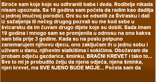 Sve to mi je probudilo želju da njena odjeća, njena šminka, njen krevet, ma SVE NJENO BUDE MOJE…Počela sam da spletkarim kako bi u njihov brak unijela nemir i razdor,