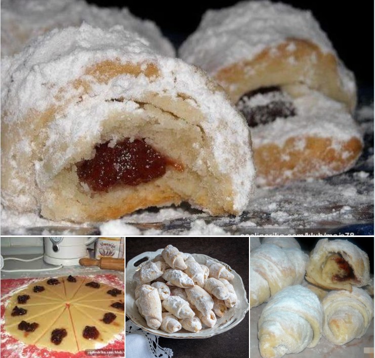 Testo podelite na 3-4 loptice (ja sam na 2 i dobila sam 16 vecih kiflica, ali mamine male su sladje) pa na pobrasnjenoj dasci najpre rukom oblikujte spljosteni krug a zatim rastanjite oklagijom. Stavite na svaki deo po malo marmelade (ja stavila fenomenalni argentinski sir od dunja) i motajte kiflice koje redjate na pleh sa pek papirom i odmah pecete dok ne porumene. Ako vam se testo lista samo pritisnite