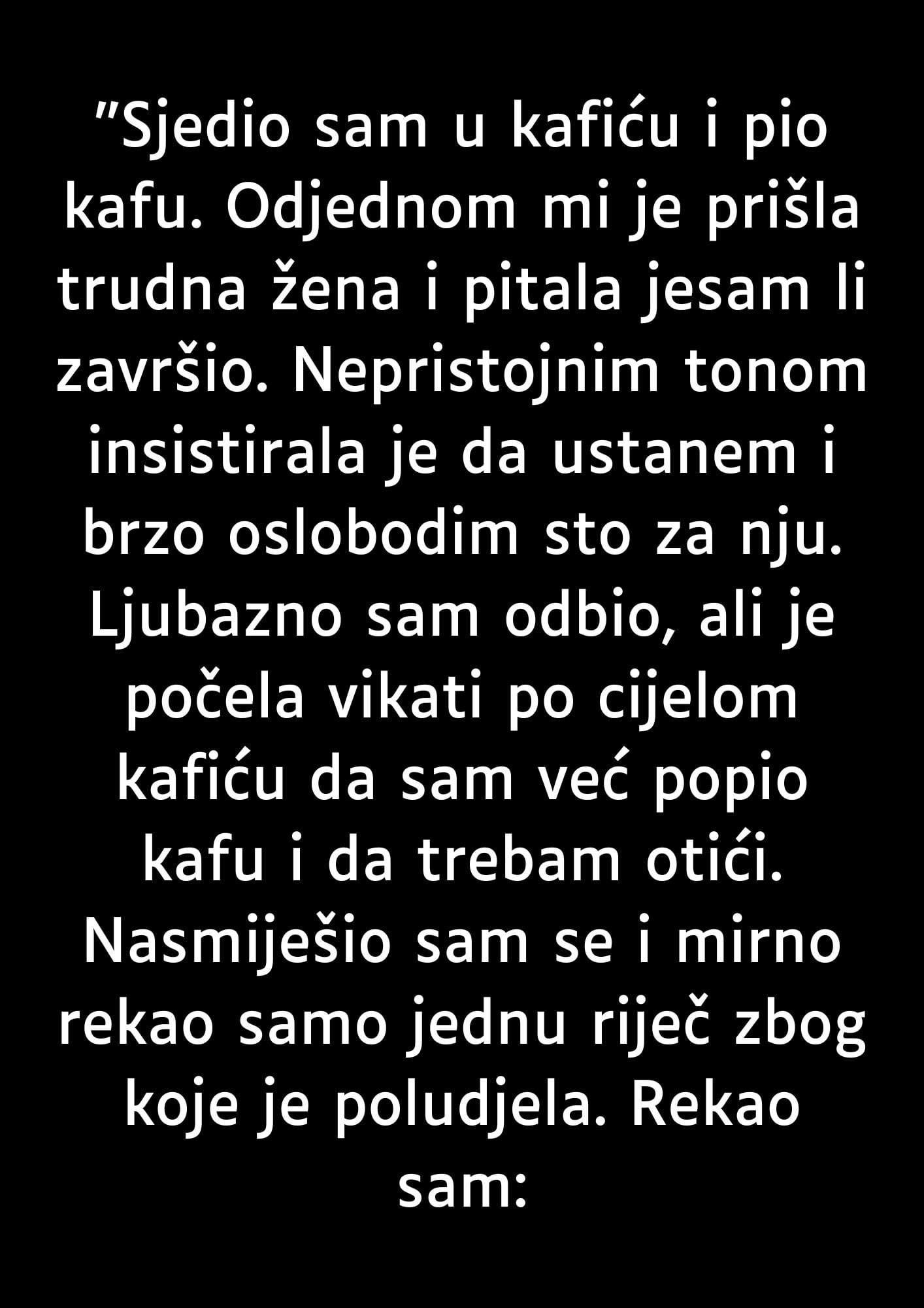 “Sjedio sam u kafiću i pio kafu. Odjednom mi je prišla trudna žena i pitala jesam li završio. Nepristojnim tonom insistirala je da ustanem i brzo oslobodim sto za nju.