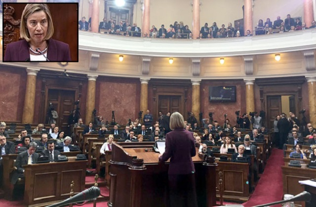 Prilikom najavljivanja Federice Mogherini, koja se obratila zastupnicima u Skupštini Srbije, političari Srpske radikalne stranke zajedno s liderom Vojislavom Šešeljom su negodovali uz glasne povike, lupanjem šakama o skupštinsku klupu i povicima “Srbija, Rusija, ne treba nam Unija”.