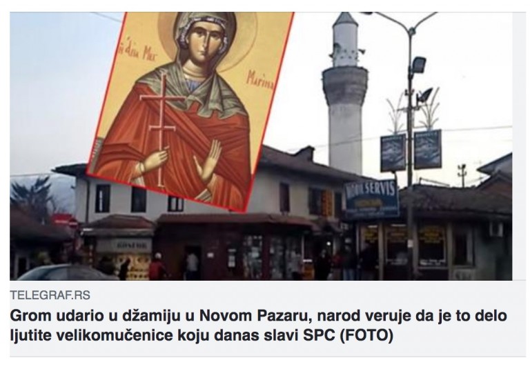 Jučer je na portalu beogradskog lista “Telegraf” objavljen skandalozan tekst koji šalje strašne poruke mržnje prema islamu i muslimanima u Srbiji. Obrađujući vijest o udaru groma u Arap džamiju u Novom Pazaru, “Telegraf” je bez ikakvog osnova naveo navodno narodno vjerovanja da je nekakva srpska velikomučenica poslala grom na džamiju u Novom Pazaru.