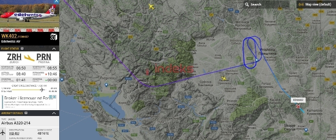 Indeksonline je pratio let aviona, koji je, kao što se vidi bio primoran da promjeni maršutu i ode za Makedoniju.