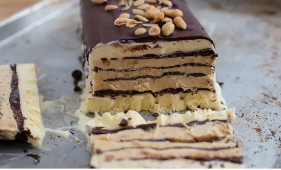 Sladoled pustite da vani malo omekša. Umiješajte u sladoled nasjeckane pekane, deserte od čokolade i kikiriki maslaca i čokoladice s kikirikijem, pa smjesu ulijte na podlogu. Pokrijte folijom i zamrznite dok ne postane tvrdo, do 2 sata. Pomiješajte smeđi šećer, vrhnje, maslac i sol u loncu na srednjoj vatri. Kuhajte uz miješanje dok se ne zgusne, 5-7 minuta. Dodajte vaniliju i kuhajte minutu.