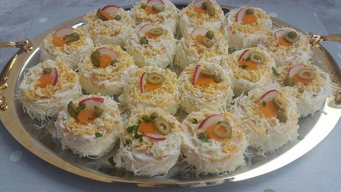 Patišpanj:4 jajeta,12 kašika brašna,2 dl jogurta,1 kesica praška za pecivo,1 kašičica soli,1 šoljica ulja,1 šargarepa,1 vezica peršuna.Fil:250 g krem sira,100 g šunke,1 kuvano jaje.