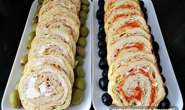 SASTOJCI:16 kora za pitu.Za premazivanje kora:4 jaja,1 casa jogurta,1 casa ulja,1 kasicica soli,1 prasak za pecivo.Za filovanje rolata:1.5 case pavlake,4 kasike ajvara,po zelji rendano suvomesnato.