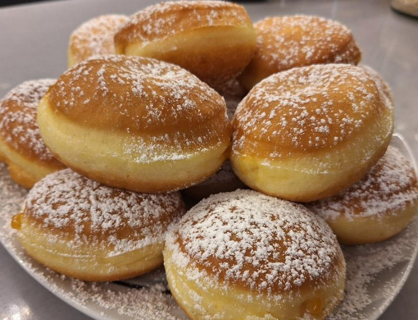 Pripremite smjesu.Žumanjke umiješajte sa šećerom, dodajte ulje, sol, konjak ili rakiju, pa mlako mlijeko, prašak za pecivo pomiješan s brašnom i dignuti kvasac. Ostavite na toplom da se diže oko sat vremena.