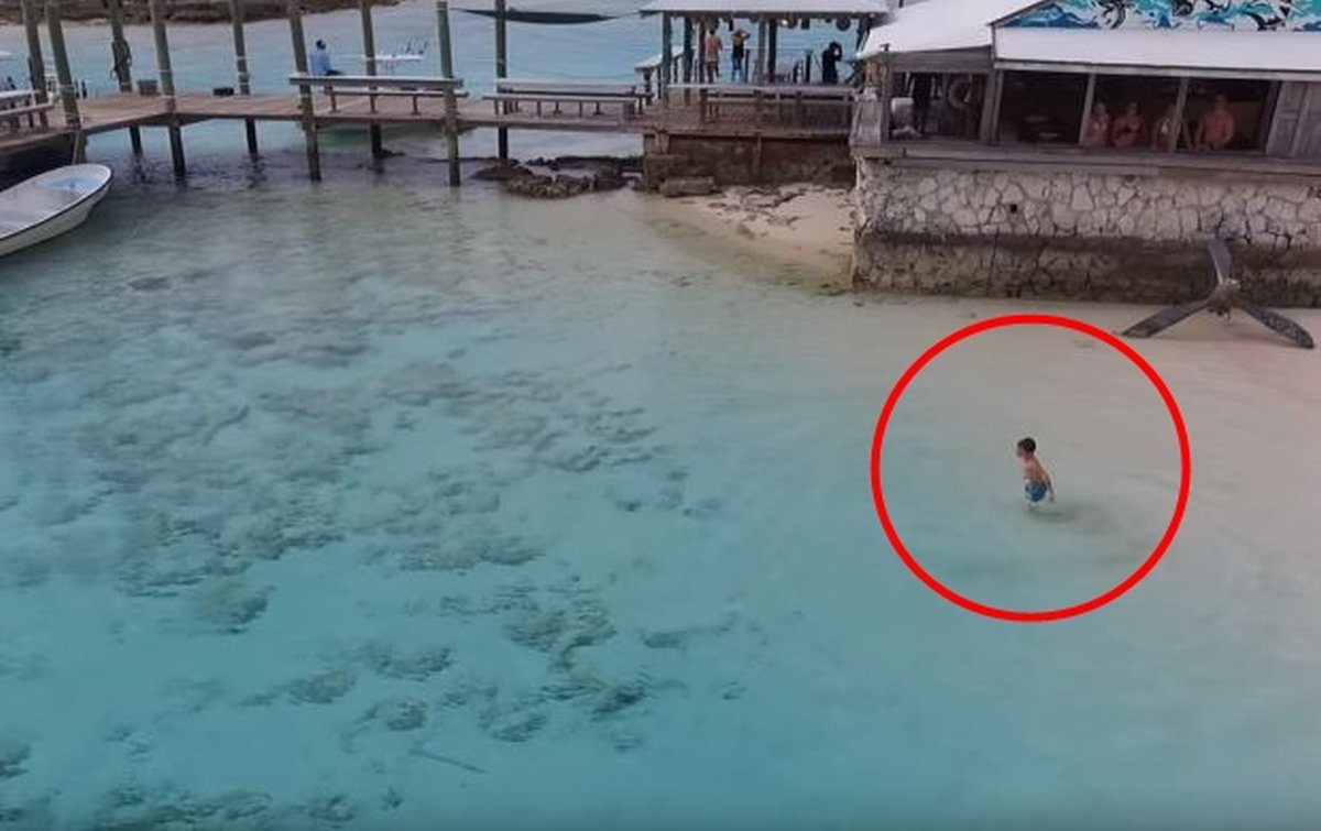 Snimak snimljen dronom na Bahamima prikazuje šokantan trenutak kada dječak za dlaku bježi od grupe morskih pasa koji su pojurili prema njemu dok se igrao u vodi.
