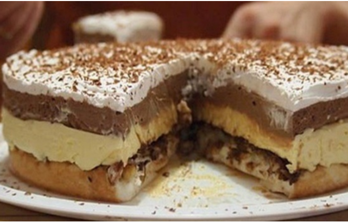 Ohlađen biskvit prevrnuti naopako, tako da dio s lješnjacima bude okrenut prema gore. Za kremu je potrebno zagrijati 8 dcl mlijeka s vanil šećerom.U 2 dcl mlijeka umutiti 2 vanil pudinga, 2 žlice brašna te 6 žumanjaka. Kad mlijeko zavrije dodati sjedinjenu smjesu pudinga, brašna i žumanjaka.