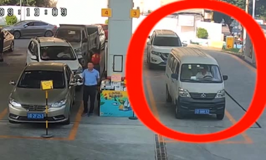Nadzorni snimci iz garaže Shell u okrugu Yubei u Chongqingu, Kina, pokazuju vlasnika srebrnog kombija gospodina Gonga kako skače kroz prozor.