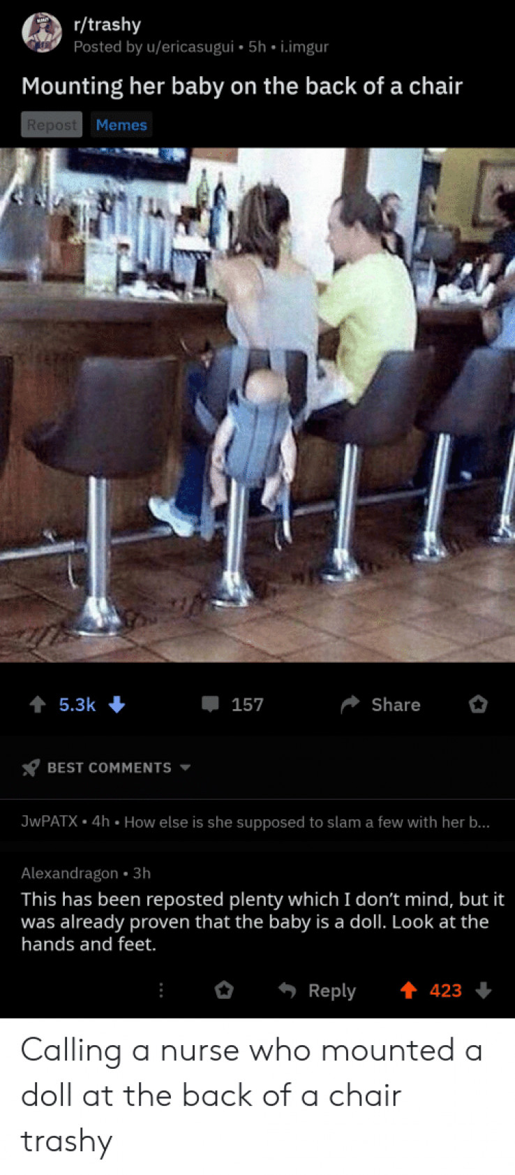 Internetom danima kruži fotografija koja je jedne šokirala, dok drugi preispituju je li stvarna. Naime, kad je žena sjela za šank kako bi popila piće s muškarcem, za stolicu je objesila nosiljku s bebom.
