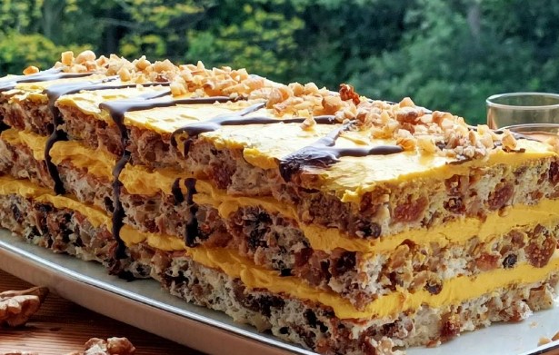 Složite tortu.Nafilajte biskvit te tortu na kraju ukrasite s malo otopljene čokolade i malo oraha.